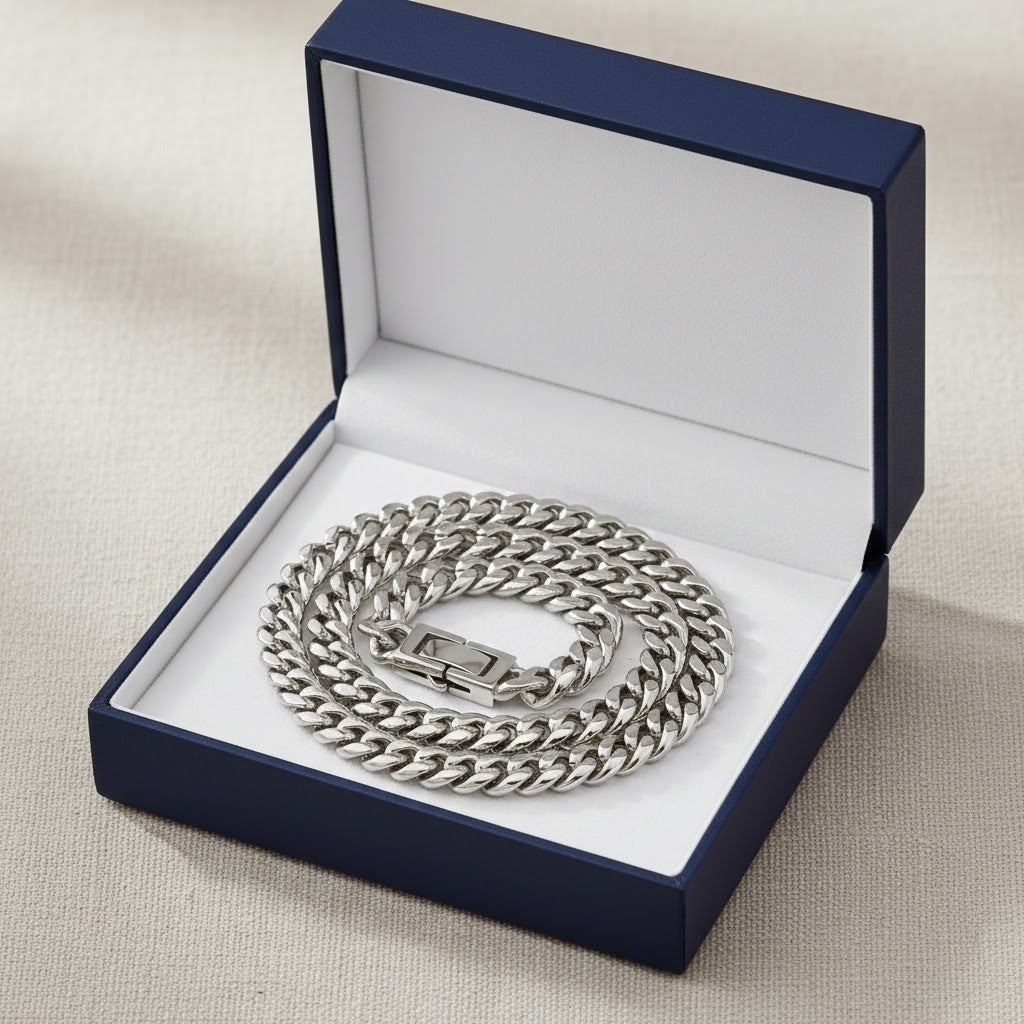 This stainless steel Cuban necklace is durable yet comfortable, making it ideal for long-term wear. Its bold chain profile and polished finish make it a strong gift choice, while its versatile unisex design allows it to pair effortlessly with a wide range of outfits and accessories.